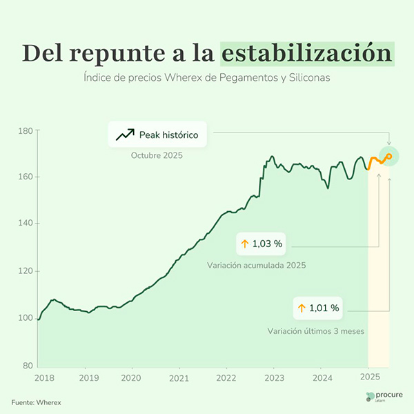 Mientras llega la nueva herramienta de los Índices de Mercado by Wherex, seguimos trayendo uno cada semana. La categoría de pegamentos y siliconas fue una de las más afectadas por las disrupciones químicas y logísticas, llegando a un máximo histórico en 2025 —con un aumento del 2.73% en lo que va del año—. Esto no solo refleja una nueva normalidad en los costos de la industria: también abre la posibilidad de renegociar y remarca la necesidad de poner un ojo sobre materias primas como resinas y solventes. En Latinoamérica, los precios de pegamentos y siliconas siguen dependiendo de los cambios en el dólar y la volatilidad de los fletes marítimos. Aunque las presiones de la pandemia han quedado atrás, la vulnerabilidad logística o los retrasos en puertos clave se vuelven prioridad para el suministro.