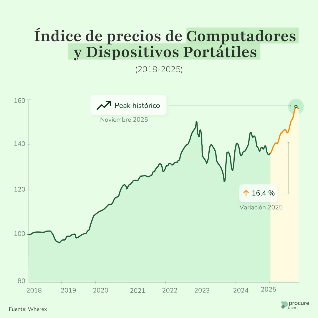 El Índice de Mercado Procure Latam by Wherex de esta semana va sobre las alzas que han sufrido los computadores y otros dispositivos portátiles. Esta categoría ha vivido uno de sus mayores aumentos desde la pandemia, un rebote que llega después de una corrección en 2023, y marca un nuevo cambio en los precios. Sin embargo, esto no tiene que ver con la logística ni los valores del dólar; se debe, en realidad, a las alzas en sus materias primas. La presión anual viene principalmente condicionada por las memorias RAM y NAND Flash, dedicada al almacenamiento.