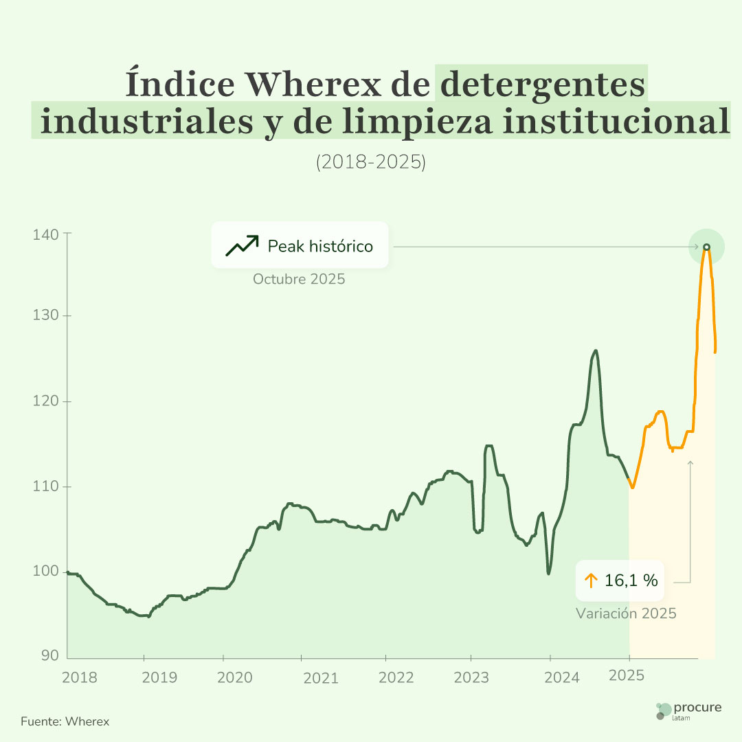 Mantener la limpieza es una tarea de todos los días. Los detergentes suelen ser un insumo crucial en cualquier faena, hospital y planta productiva. Sin embargo, sus precios sufren tantas fluctuaciones como las de los insumos más visibles en el suministro. Tras una fuerte corrección del 8.6% durante 2023, los detergentes comenzaron a aumentar sus precios muy lentamente, llegando a su peak en octubre de 2025. Hoy, si bien su precio se ha regulado un poco más, suman un aumento del 12.67% desde enero de 2025. Ahora, sin embargo, se espera que los aumentos extremos de este ciclo comiencen a disminuir.